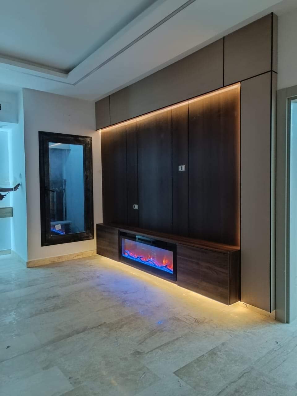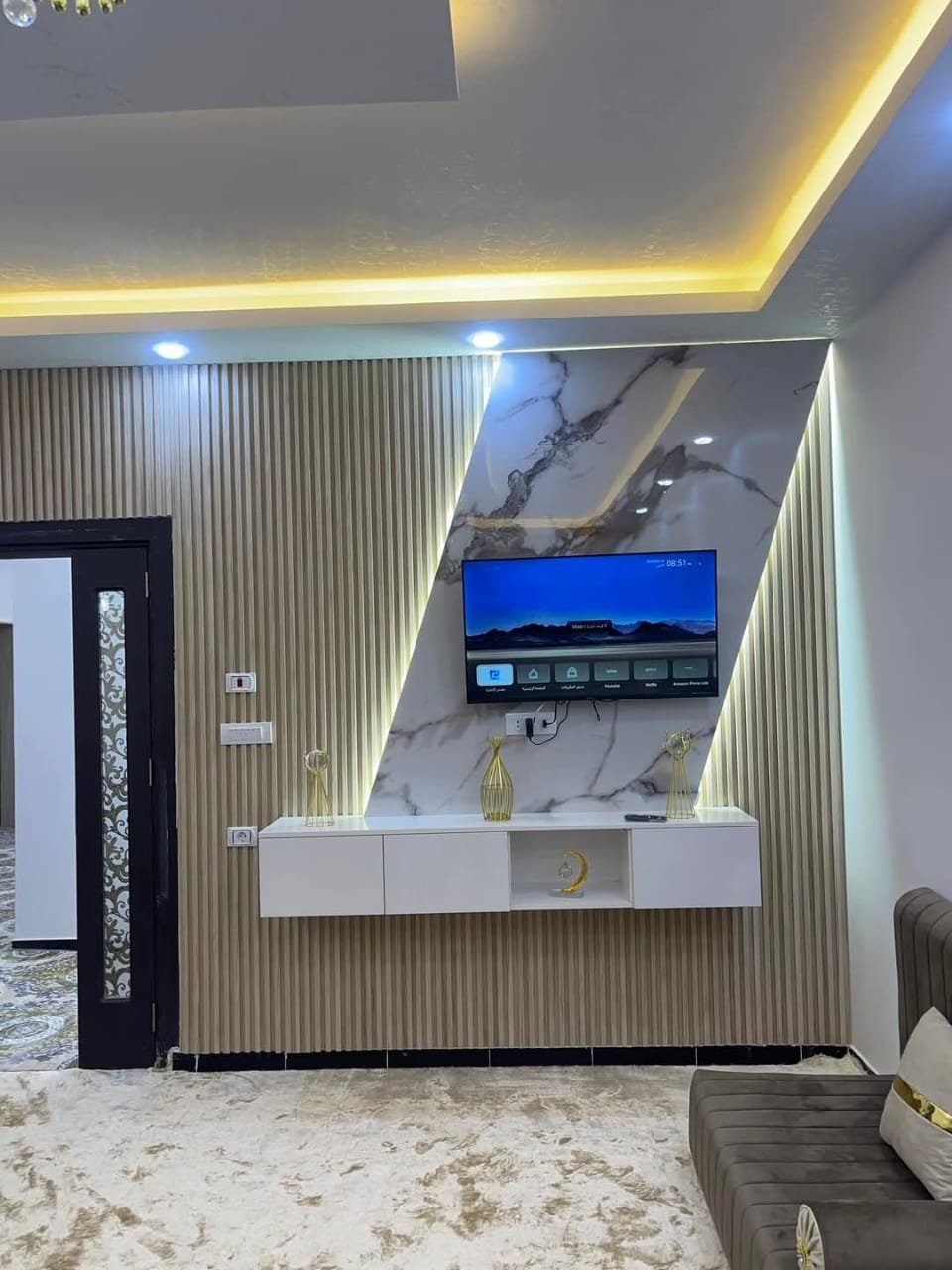 إكمال التصميم بلون طاولة تلفزيون بسيط أسفل الشاشة أو رف عائم بسيط.
