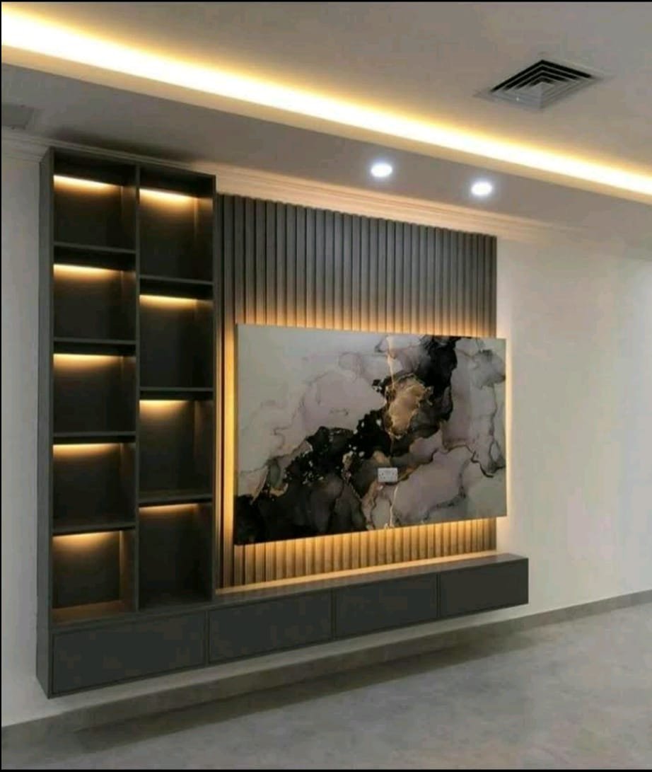 هي تصاميم جدارية مبتكرة مصنوعة من مواد مختلفة، مثل الخشب، MDF، المعدن، والديكورات الحجرية، تهدف إلى إبراز تلفزيونك بشكل أنيق مع توفير مساحة تخزين إضافية.