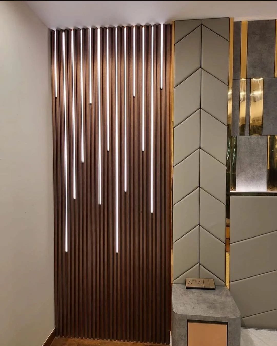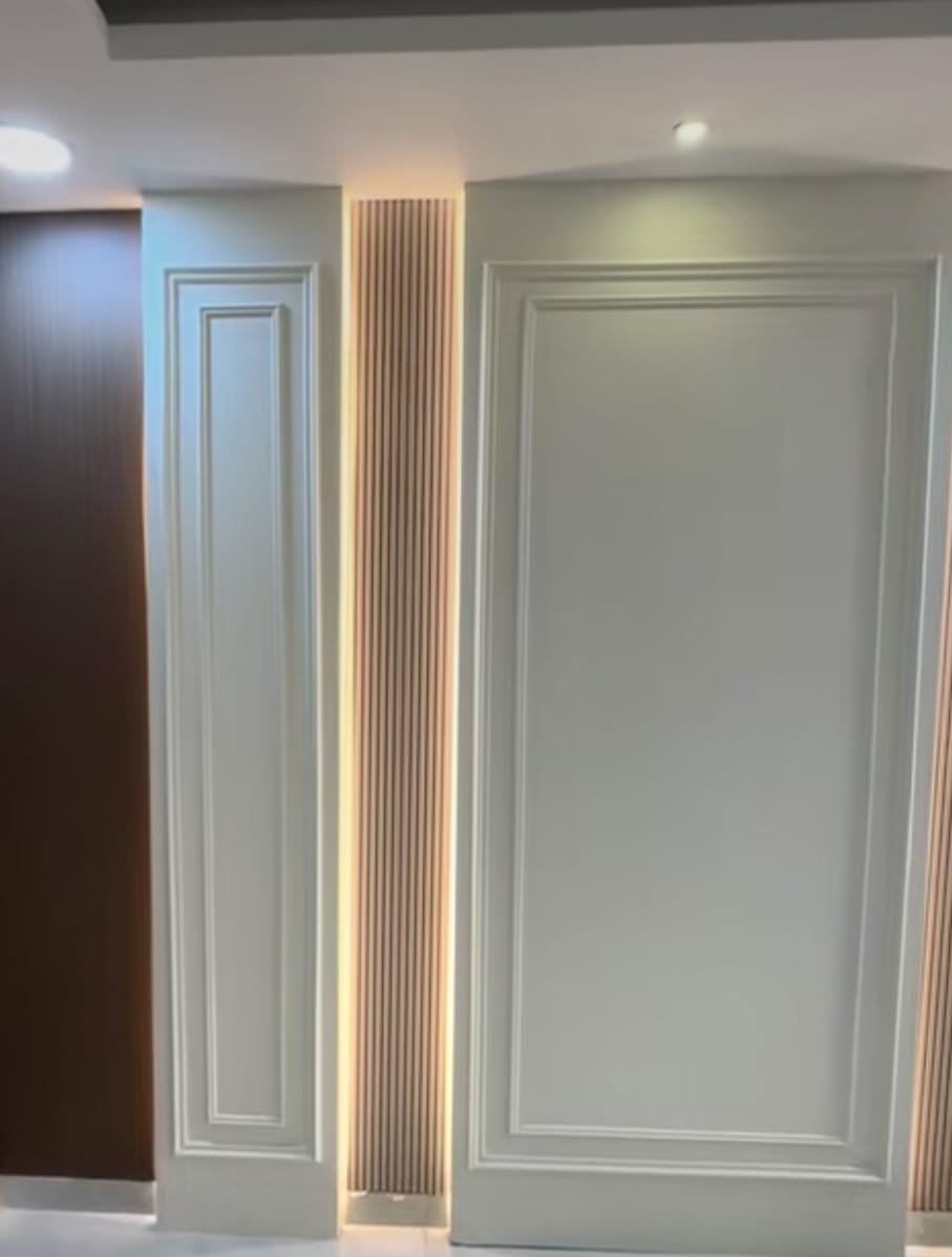 تُستخدم الألواح الخشبية أو MDF بتشطيبات لامعة أو مات لإضفاء دفء ورقي على الغرفة.